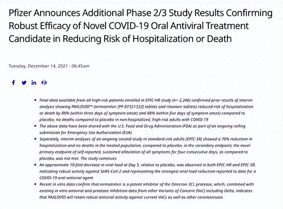 在几个月前,辉瑞公司就发布了这种药物的临床试验分析,试验结果表明它的效果非常好。这种口服药能够降低89%患者的住院率以及死亡率。